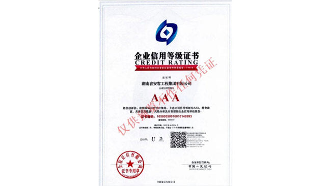 在今年的全國征信評定活動(dòng)中,湖南省安客工程集團有限公司又一次脫穎而出,再度榮冠成為2022年度“企業(yè)信用等級3A”企業(yè),為集團品質(zhì)品牌升級邁向新的高度,凝聚更多力量,注入更多動(dòng)能。